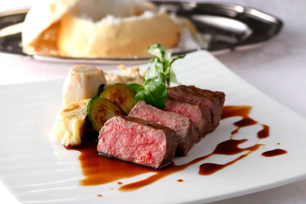 マンスリーメニュー 福井県産“若狭牛”サーロインの塩釜焼と“九頭竜まいたけ”のフリット、“米五味噌”のソース 15,000円(税込)