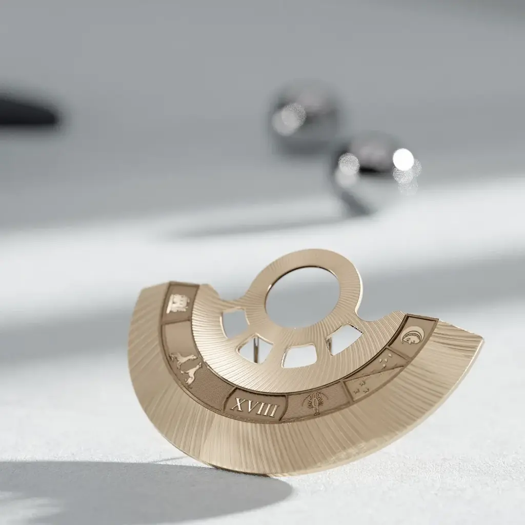 プレスリリースには、ORIGINのムーブメントに組み込まれた特製ローターの装飾に関する記述もあります。17世紀のタロットカードに着想を得たローターには、2匹のオオカミ犬、塔、ザリガニ、そして月が精緻に刻まれており、古の象徴が回転する様が時の流れとともに月の神秘を語るとしています。