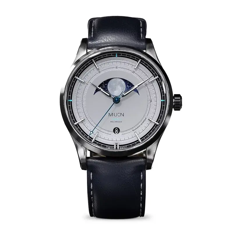 MU:Nは北欧的なミニマルラインを基調に、自然から着想を得た色彩と質感を組み合わせることで「静かな存在感」を表現しています。ケースエッジは柔らかく整えられ、文字盤は光の角度で表情を変え、月の満ち欠けを想起させる奥行きを演出します。