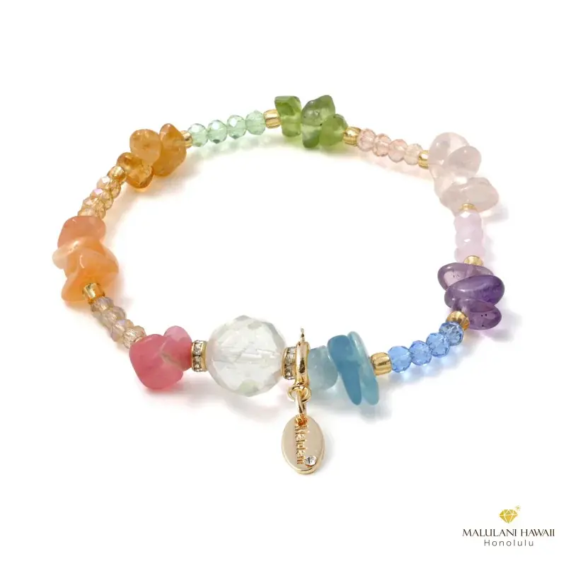 ハワイアンレインボーをイメージしたブレスレット。愛、健康、金運、厄除け、幸福のお守りとしての意味合いが説明されています。 - Floral Amulet Charm – https://malulani.info/?pid=188072777