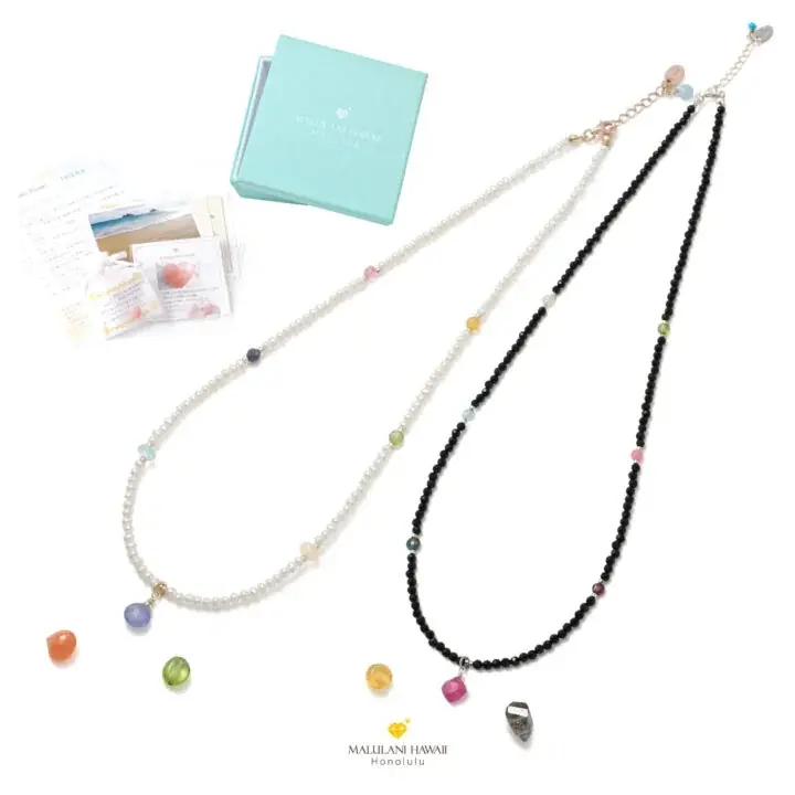 マルラニハワイが今回おすすめする対象商品には、ハワイの自然や伝統的イメージを反映したデザインが揃います。天然石を用いたブレスレットやチャーム、オーダーメイドのネックレスなど、日常使いしやすいものから特別感のある一点ものまでラインナップされています。