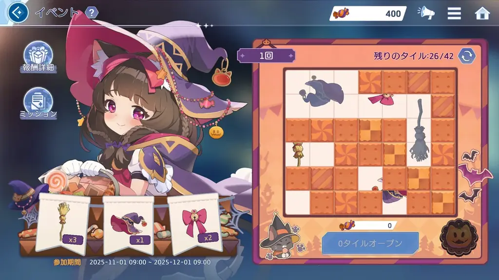 • 「痕跡を探す」イベント:ゲーム進行に必要なAPを一定量消費するとハロウィンキャンディが獲得でき、そのキャンディでタイルを開いて隠された痕跡を見つけるとアイテムが入手可能。