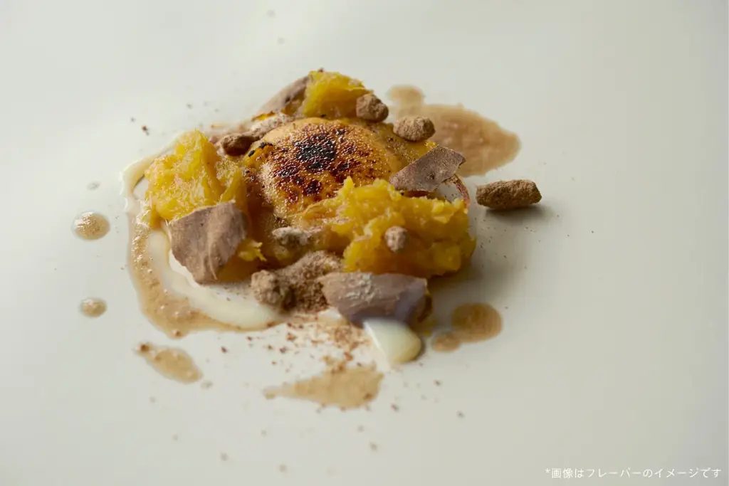 今回の「Annoimo」では、安納芋のペーストに焦がしバター、バニラ、黒糖を合わせることで甘味と香ばしさのバランスを整えています。また、焼き芋の香りを意図的に加えるために、なると金時をフードプロセッサーで細かく砕いた後にオーブンで焼き上げた自家製の焼き芋チップスを生クリームに加えて煮出し、その香りを生地に取り入れる手法を採用しました。