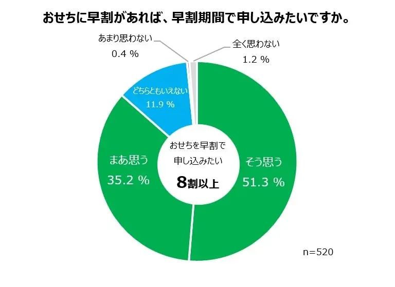 - 「おせちに早割があれば申し込みたいか」:86%が「そう思う」「まあ思う」と回答