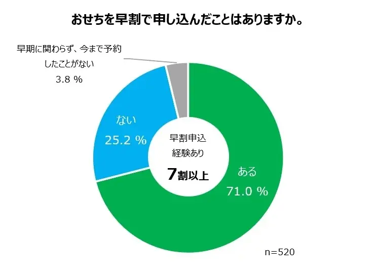 - 「おせちを早割で申し込んだことがあるか」:71%が「ある」と回答