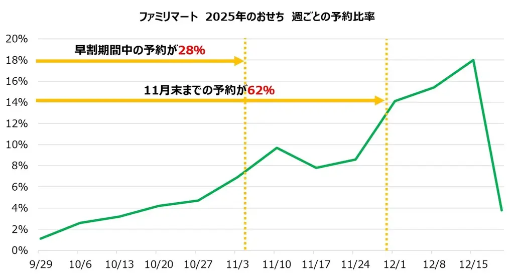 開始から21日目におけるファミマオンラインでの予約実績は前年同日比で146%に達しており、特に早割対象商品の予約数は前年同日比で193%増と大きく伸長しました。ここでの計測期間は2025年9月24日(水)~2025年10月14日(火)です。なお、一部地域で取り扱いのない商品がある旨も記されています。
