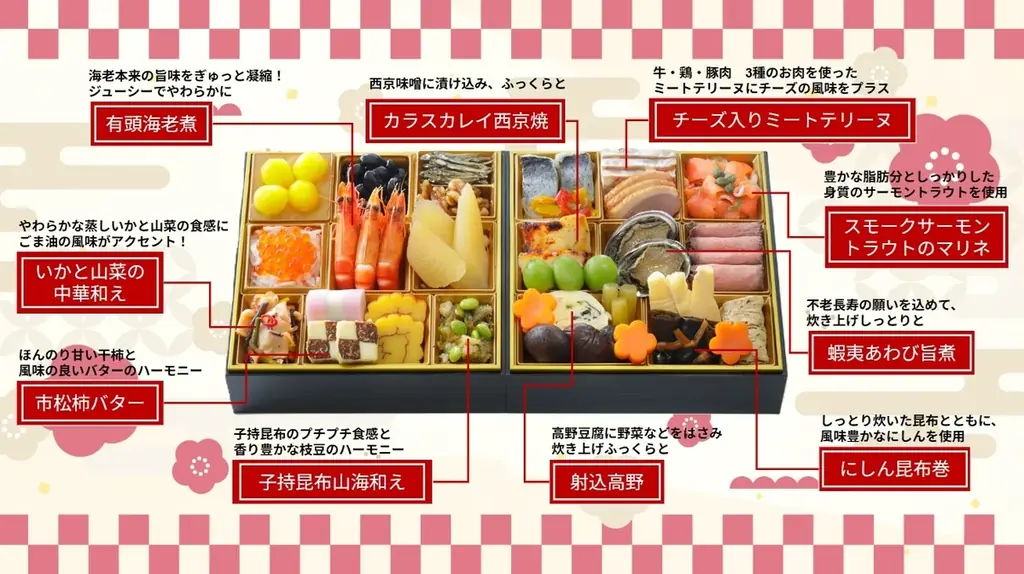 早割対象商品は昨年の7品から10品に拡大し、創業300余年の仕出しの名店「八百彦本店」のおせちも早割対象に加わりました。以下に、プレスリリースで示された早割対象商品の内容を価格、内容量、提供方法、備考まで含めて整理します。
