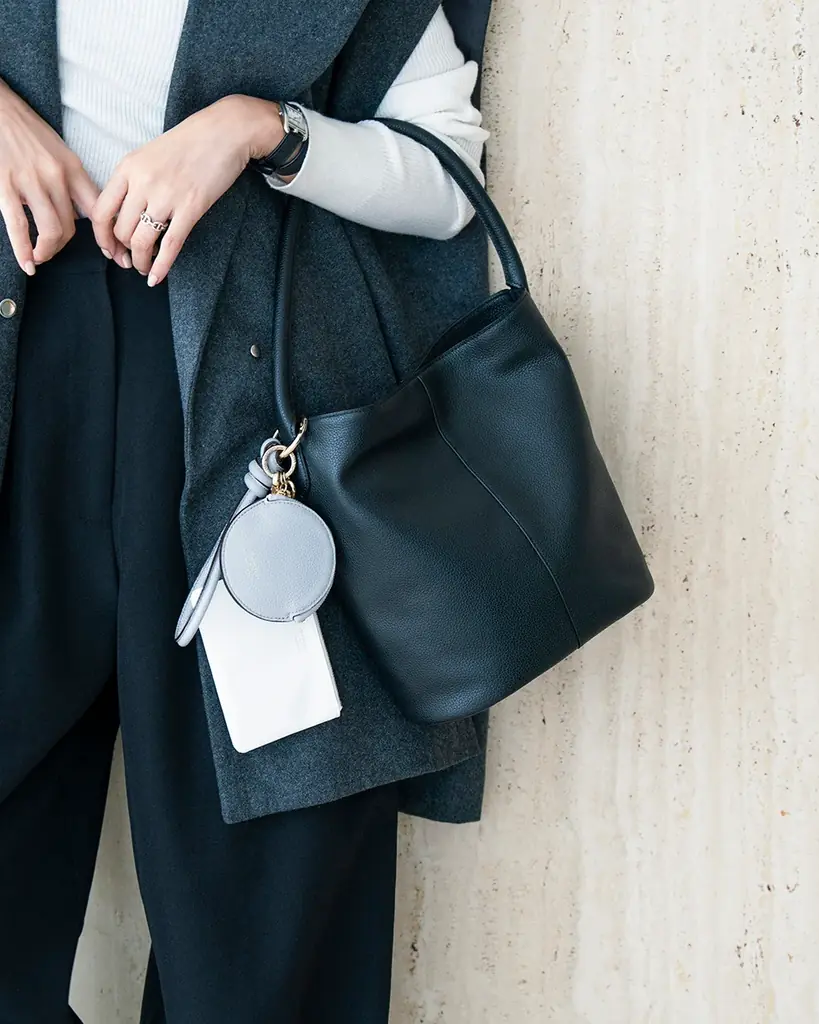 デザイン面では、容量とフォルムのバランスが重視されており、内部の仕切りや持ち手の仕様により日常の収納性が確保されています。合わせる服装の幅が広いため、ワードローブに取り入れやすいアイテムです。