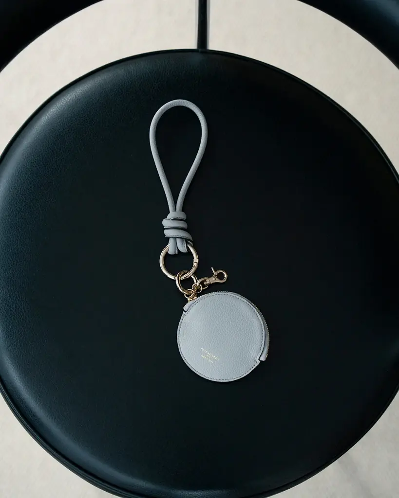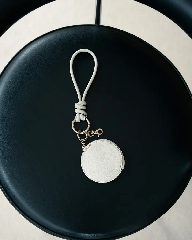 ラウンドコインケースは表面にシボ感のあるレザーを用い、特徴的なストラップがデザイン上のアクセントになっています。単体での使用はもちろん、バッグのチャームとしても機能します。