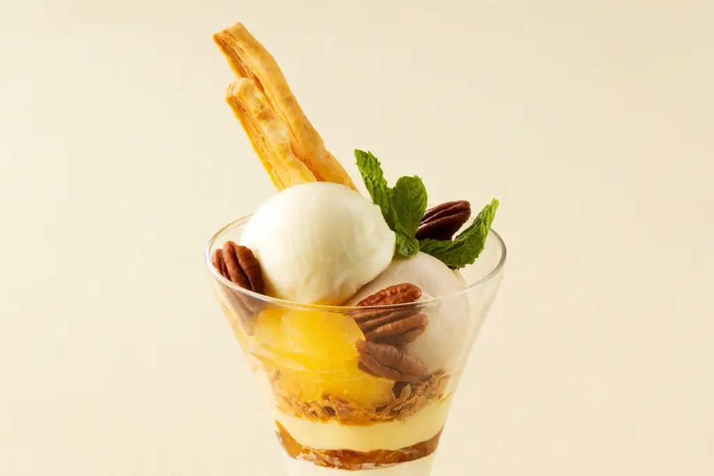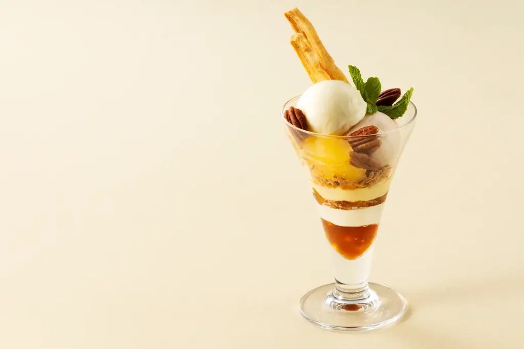 パフェはグラスの底にグランドアールグレイのジュレを敷き、その上にグランドアールグレイのジェラート、りんごやピーカンナッツ、りんごのソルベを重ねた構成です。食べ進めるごとにジュレ、ジェラート、ソルベと口中に異なる紅茶の余韻と果実の風味が広がります。
