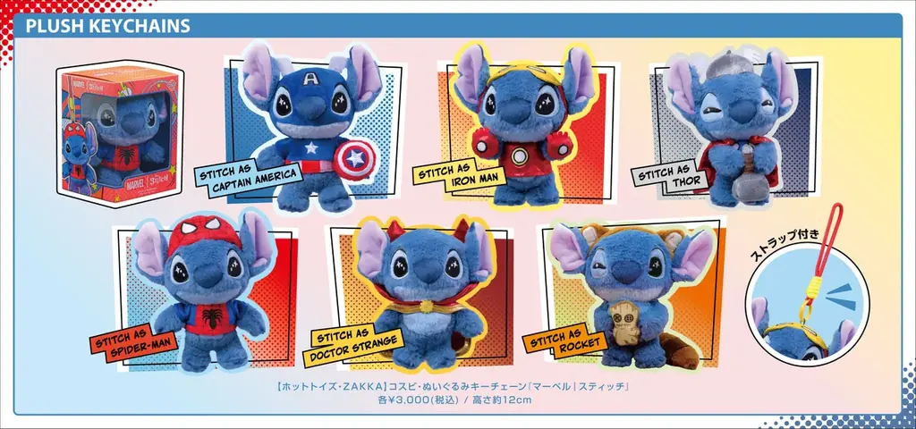 - キーチェーン(スティッチ/スパイダーマン、スティッチ/アイアンマン、スティッチ/キャプテン・アメリカの全3種):各1,000円(税込)