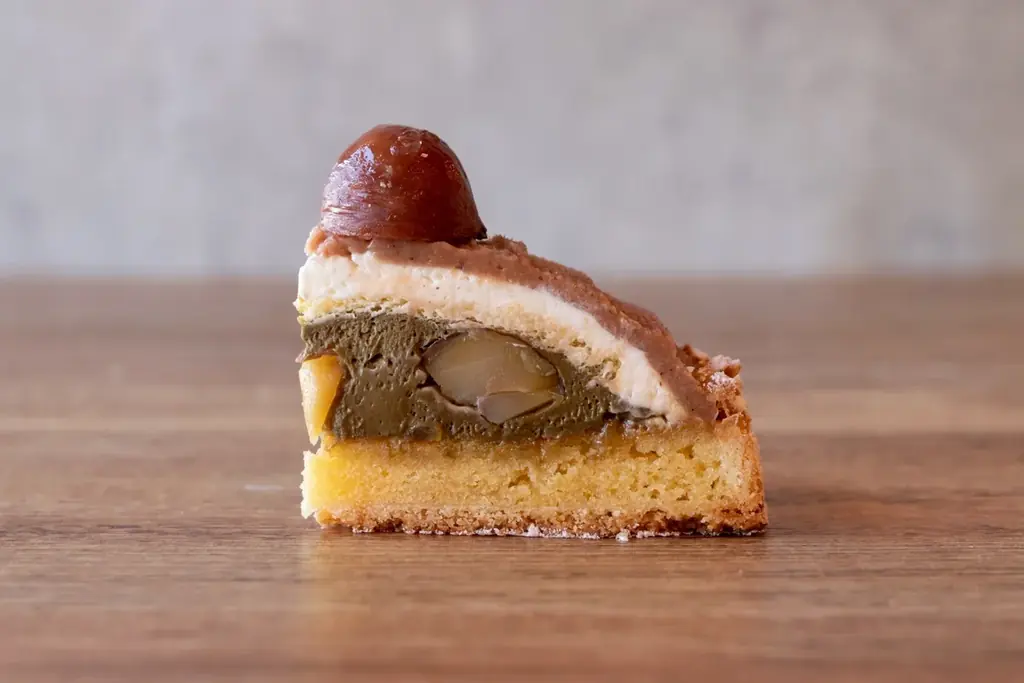 和の要素を取り入れたほうじ茶マロンタルトは、香ばしいアーモンドタルトを土台に、栗を混ぜ込んだほうじ茶クリームをたっぷりと載せたタルトです。マロンクリーム、生クリーム、特製スポンジ、パイクラムを重ね、上には栗の甘露煮が飾られます。