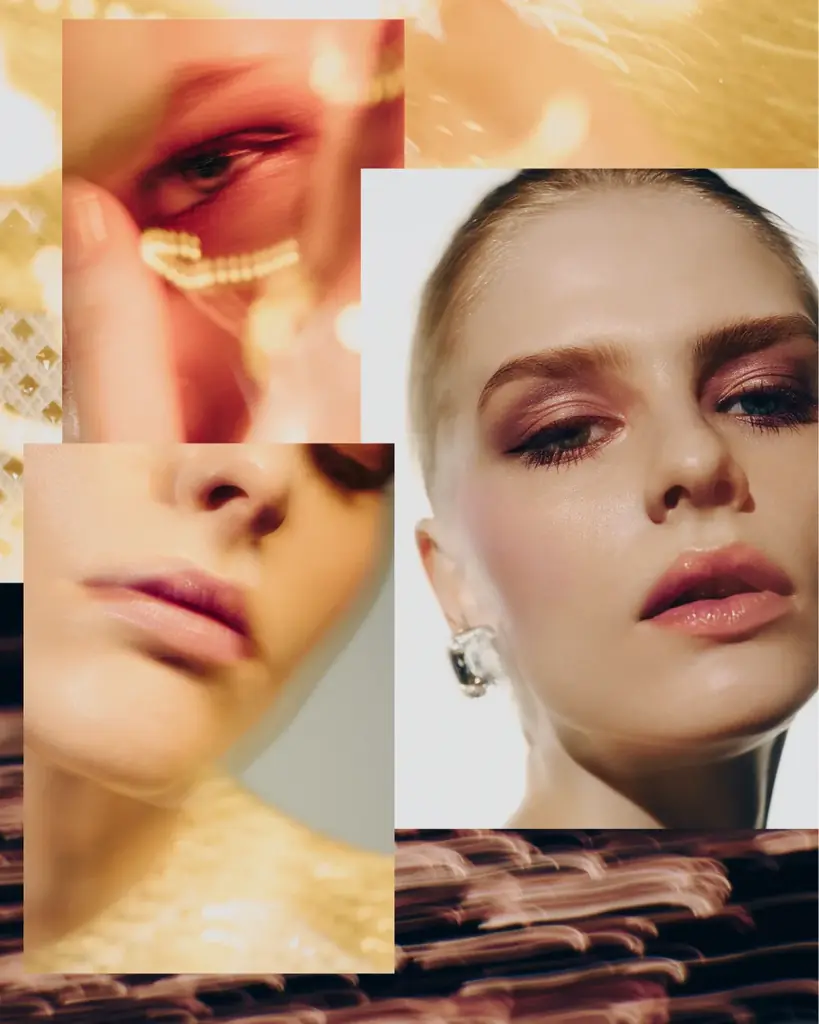 - 右上:アイカラー — ブロンズや偏光パールがサテンのように光を掴み、まぶたに奥行きを宿すヌーディモーヴ。