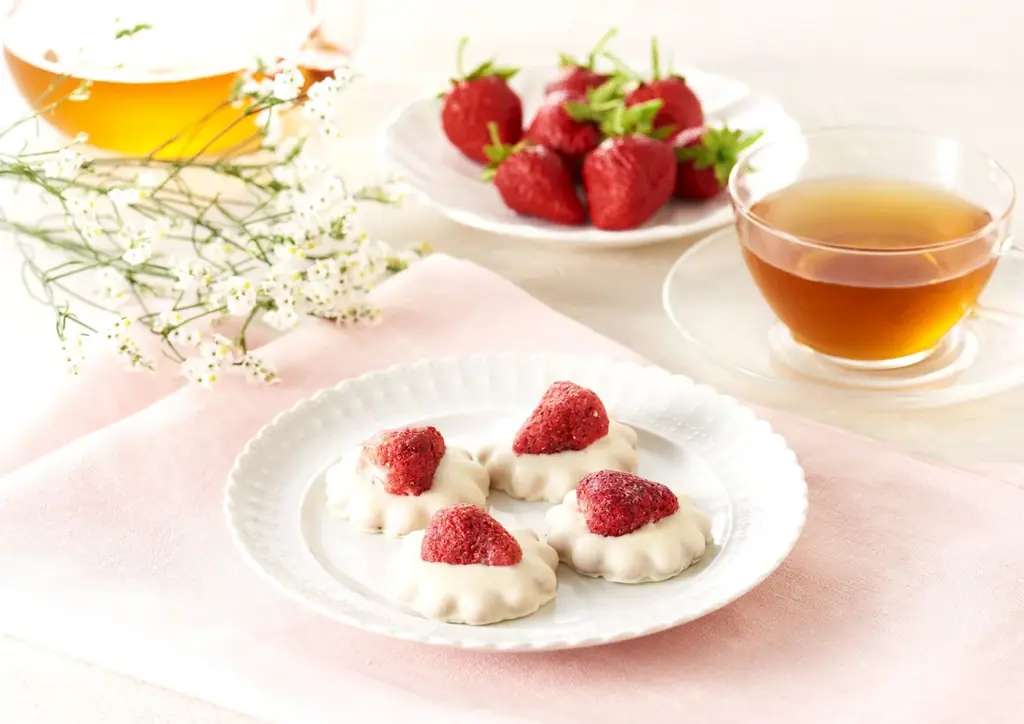 クッキーのベースには苺ペーストとフリーズドライ苺を配合し、苺の香りと酸味を残すことで「ショートケーキ」を連想させる味わいを目指しました。練乳のやさしい甘みが苺の風味を引き立て、白いチョコレートのコーティングが生クリームのふくよかさを補完します。