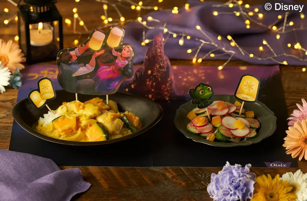 ランタンを夜空に飛ばす名シーンを模した演出は、シチューに差し込むピックやランチョンマットとの組み合わせで立体的な見栄えを作り出します。ランタンの灯りはシチューの色合い、ラプンツェルの髪はかぼちゃのやわらかい色味で表現しています。