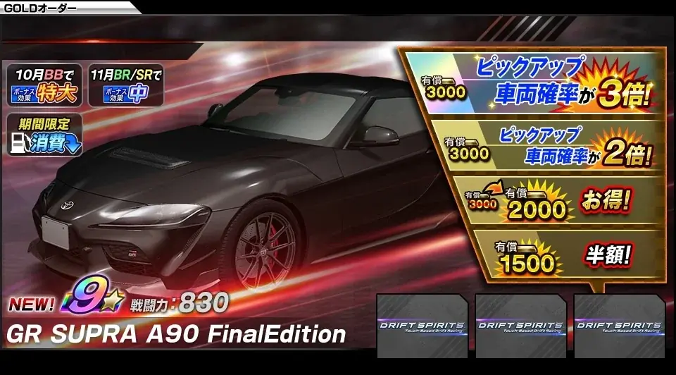 LEGENDオーダー(GR SUPRA) 新★9: GR SUPRA A90 FinalEdition 登場 開催中 ~ 11月27日 13:59(予定) 画像は開発中、提供割合等はゲーム内で確認