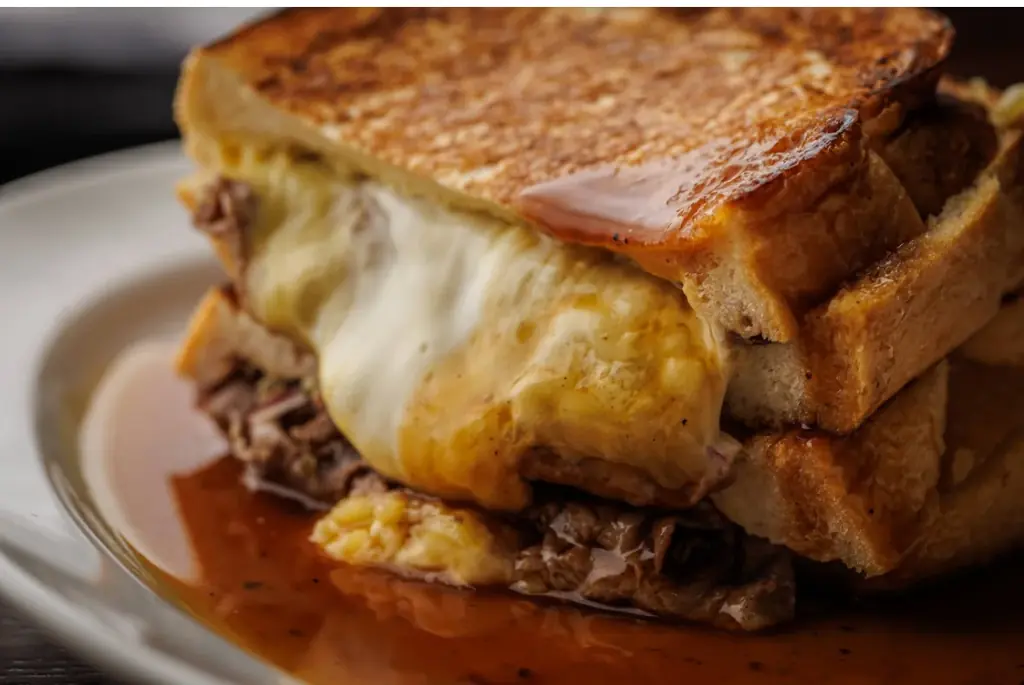フレンチディップサンドはローストビーフとチーズを挟み、その場で焼き上げるホットタイプのサンドで、熱々のチーズの食感を楽しめます。またメルトメープルフレンチトーストは生クリームと高級メープルシロップをかけて提供される“大人のスイーツ”として紹介されています(写真はイメージ)。