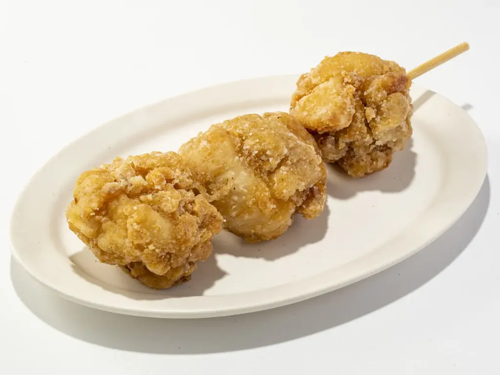鶏三和 弁当・惣菜(エキュート上野初) 醤油こうじ唐揚串 1串 499円 名古屋コーチンを中心とした鶏惣菜を提供。醤油こうじに漬け込み揚げた唐揚串など、食べ歩きに向く商品を用意。
