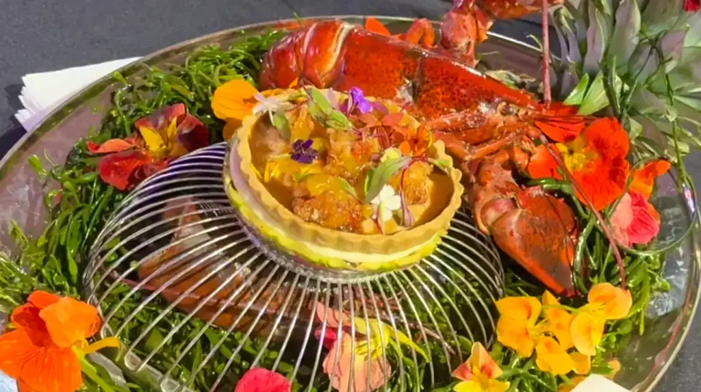 決勝披露メニュー: 「ポップコーンロブスタータルト」。決勝では”懐かしさ”をテーマに、柿の種や海老のフリットなどを組み合わせた作品を披露しました。