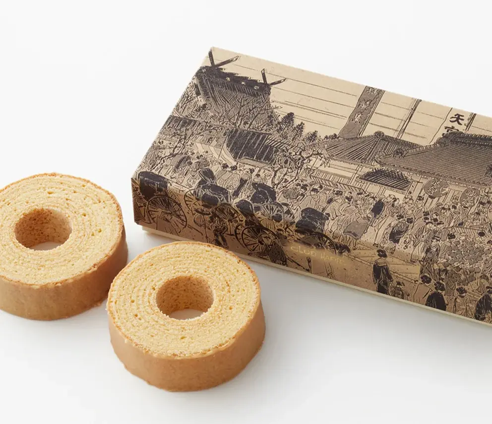- バームクーヘンmini 和三盆:2個入 1,242円(税込)〜。和三盆糖の繊細な甘さを生かす専用レシピで焼き上げ、和三盆のフォンダンで仕上げたバームクーヘンmini。2個入パッケージには水天宮の賑わいを描いた明治時代の石版画を用い、末永いご縁を願う意匠。日持ち:7日。