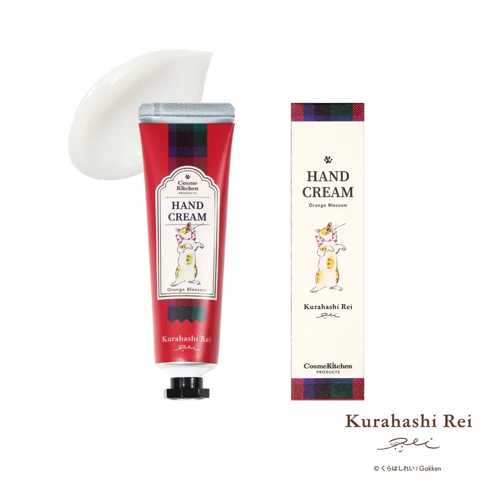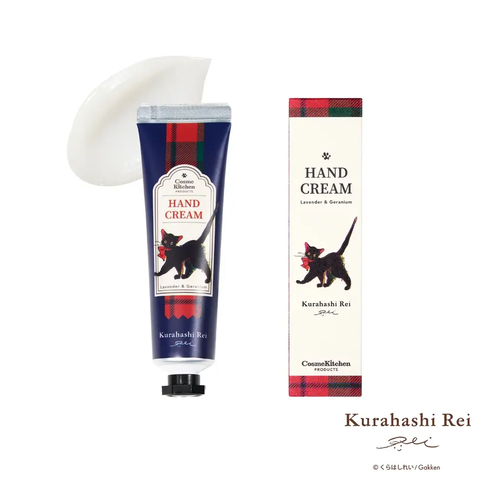 仕様:Cosme Kitchen Productsのハンドクリーム。おいしい美容成分が手肌になじむ処方で、ラベンダー&ゼラニウムとオレンジブロッサムの2種類。リボンをつけた描き下ろしねこイラストをパッケージに採用。