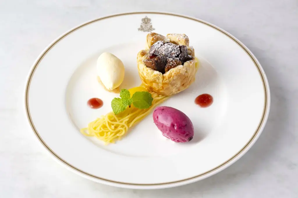 伝統のアイスモンブランクリームに、丹波栗と笠間栗という高級栗を贅沢に使用し、焼き上げたマロンパイです。大粒のごろっとした栗の食感と香りが特徴で、サクサクのパイを温かいまま提供します。