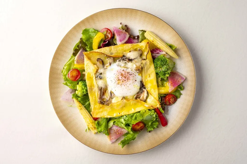 もっちりとした食感が魅力の米粉のガレットに、ベーコン、きのこのソテー、ほうれん草、卵を包み込み、プレートにはサニーレタス、ケール、パプリカ、トマト、紅芯大根などたっぷりの野菜を添えています。ヘルシー志向の利用者を想定したバランスの良い一品です。
