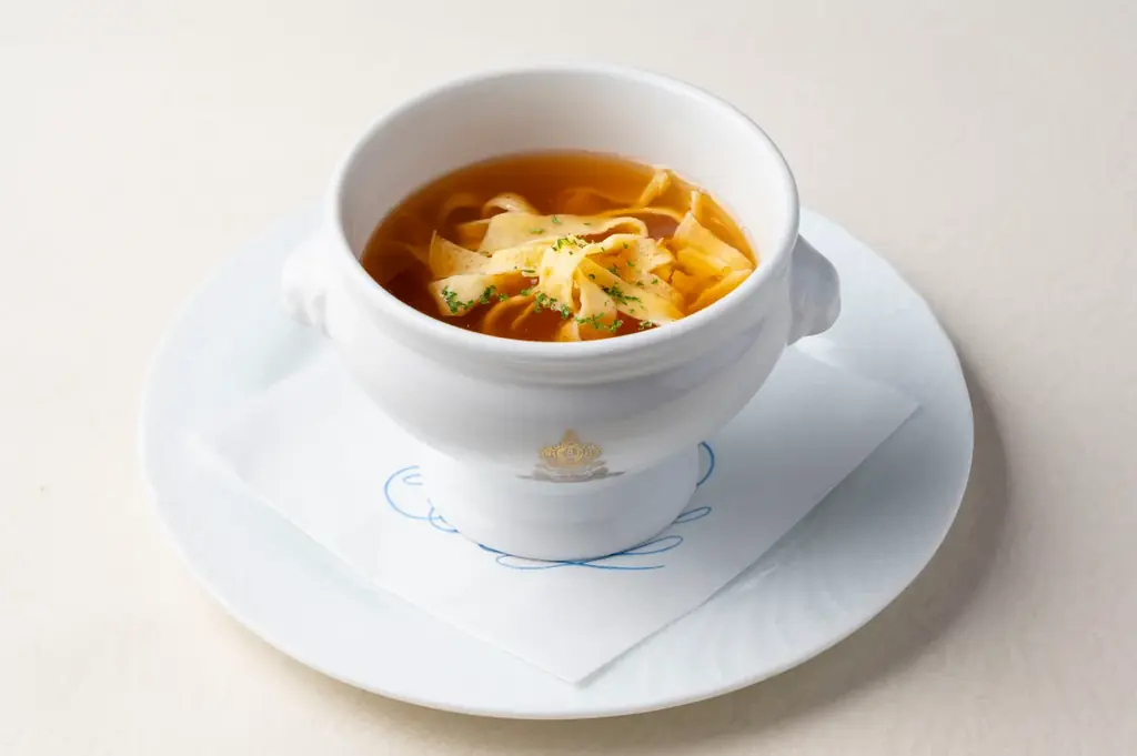 「フリターテン・ズッペ」は、米粉のガレットをパスタのようにスープと一緒にいただくオーストリアの伝統料理をベースにしています。コロンバンの提供では、スープのベースに海老名自社農園で収穫した無農薬の玉ねぎを使用し、玉ねぎの優しい甘みを活かした心温まる一皿に仕上げています。
