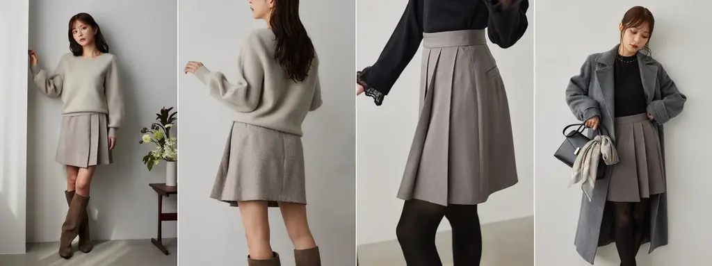 具体的な着用シーンとしては、前述の通りワンピースはレストランやシアター、美術館などフォーマル寄りのデートシーン、または少し華やかにしたいパーティーシーンでの活用が想定されます。スカートは普段のオフィスカジュアルから週末の外出、タイツとショートブーツやロングブーツを組み合わせた定番の冬コーディネートに適しています。