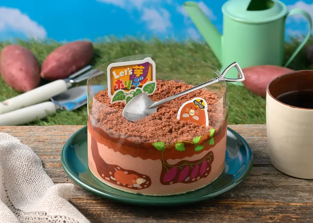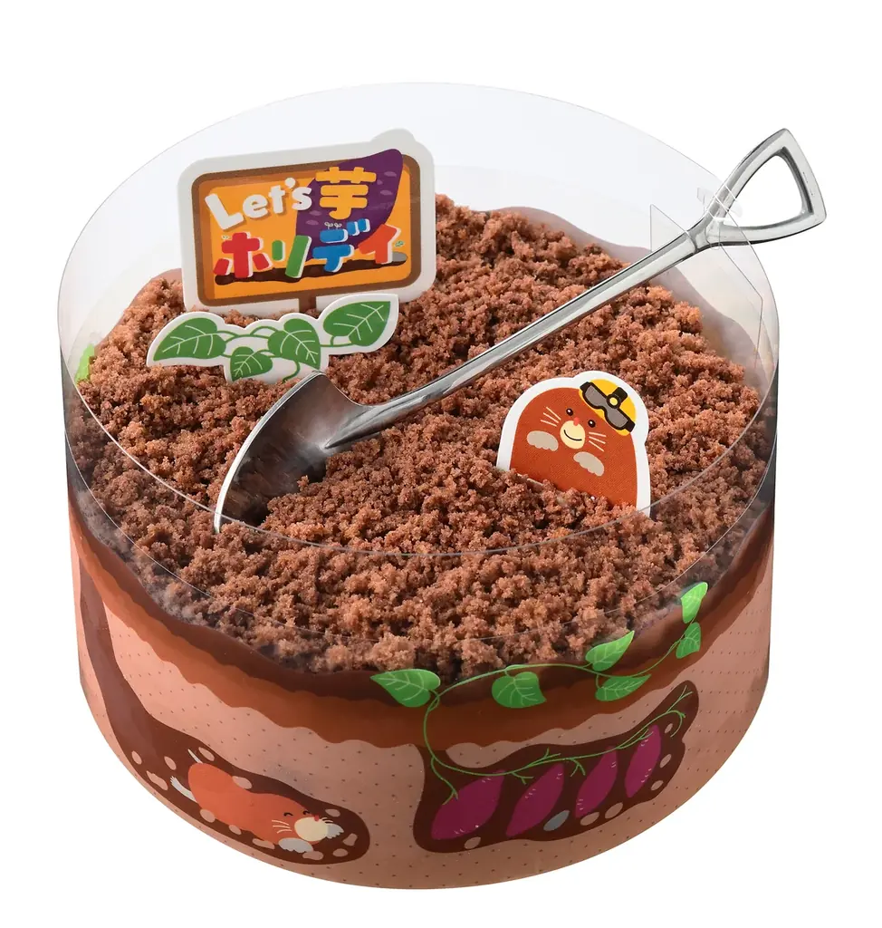 | 商品特徴 | ココアスポンジとさつまいもクリームで表現した「芋畑」デコレーション。カットしたさつまいも5個が埋まっており、付属のスコップ型スプーンで掘り当てる体験が可能。モグラピックや外側フィルムで演出。 |