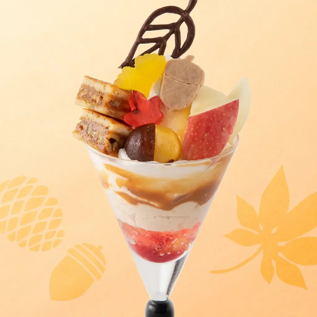 各店で共通するコンセプトは、実りの秋に収穫されたフルーツをベースに、紅葉や落ち葉、動物をモチーフにした焼き菓子などで「秋らしい見た目」を演出する点です。リスやくま、どんぐりなどの可愛らしい焼き菓子が添えられるパフェや、紅葉の色合いを表現した層構成のパフェなど、視覚と味覚の両方で季節を感じられる構成になっています。