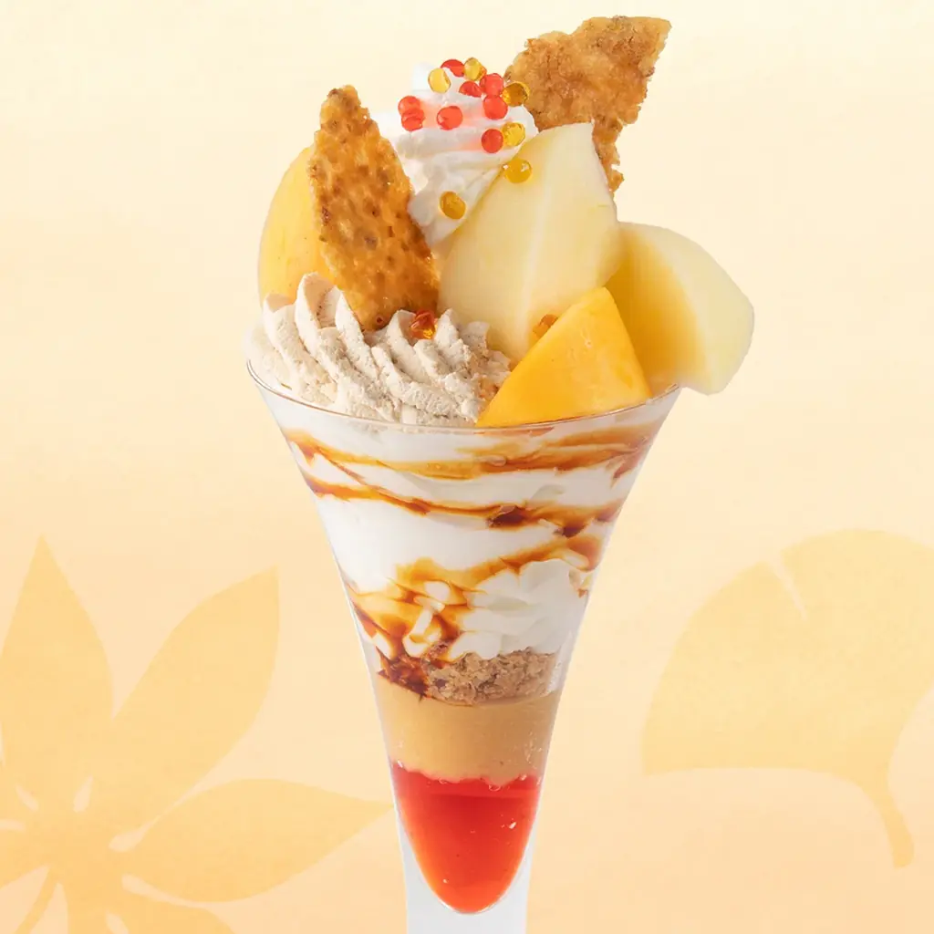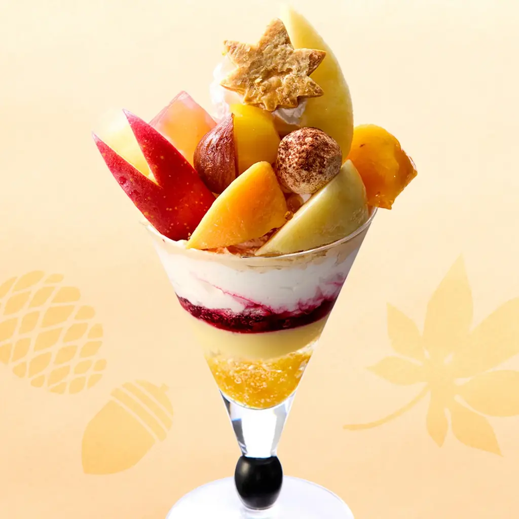 パフェにはその時期に入手しやすい秋果を中心に使用し、紅葉をイメージした色合いのパーツで全体をまとめています。食感の変化を生むトッピングが加えられている点も特徴です。