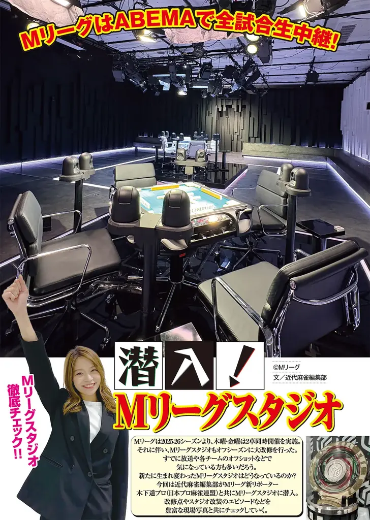 巻頭カラー企画は「潜入 Mリーグスタジオ」。今季から二卓開催に対応するために大幅改修を施したスタジオに、新リポーターの木下遥が潜入取材を行い、改修の背景や現場の様子、レポーター視点で見えた運営上の工夫などをレポートしています。取材記事は技術的な変化だけでなく、選手や関係者の声も交えた構成です。