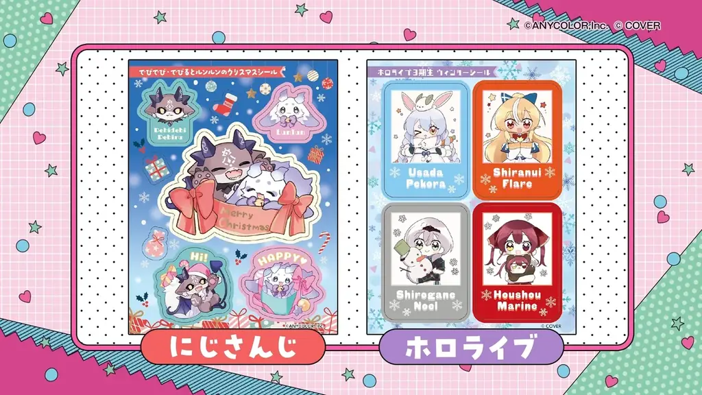 にじさんじ関連では、11月にコミックス『でびるんしぇあはうすっ』の第1巻が発売されることに合わせ、でびでび・でびるとルンルンがクリスマスプレゼントをテーマにしたシールとして収録されています。デザイン面では季節感を取り入れたモチーフが採用されています。