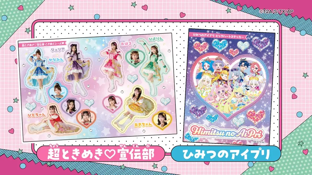 - 全身シールとハート型シールが収録されています。ビジュアルは活動時の衣装を活かしたデザインです。