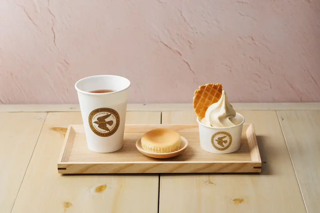 - チーズガーデン(タワーヤード 2階): 手茶と御用邸ミニチーズケーキ・チーズケーキソフトセット(イートイン限定)¥980。提供期間は2025年11月18日(火)まで。人気の御用邸チーズケーキ(ミニ)とチーズケーキソフトをオリジナルブレンドティー「手茶」と合わせるペアリング企画メニュー。