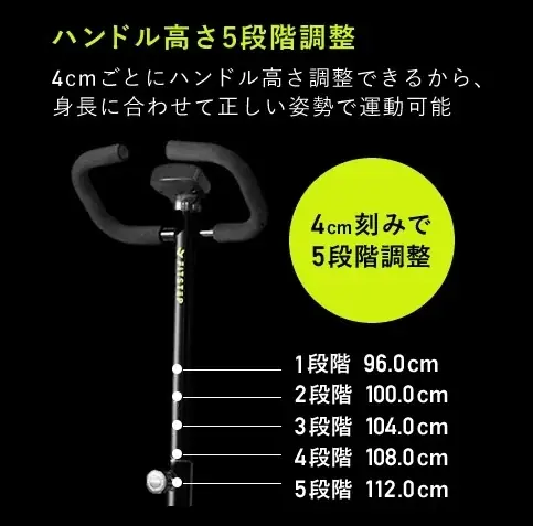 - 5段階(1段階:112.0cm、2段階:108.0cm、3段階:104.0cm、4段階:100.0cm、5段階:96.0cm)