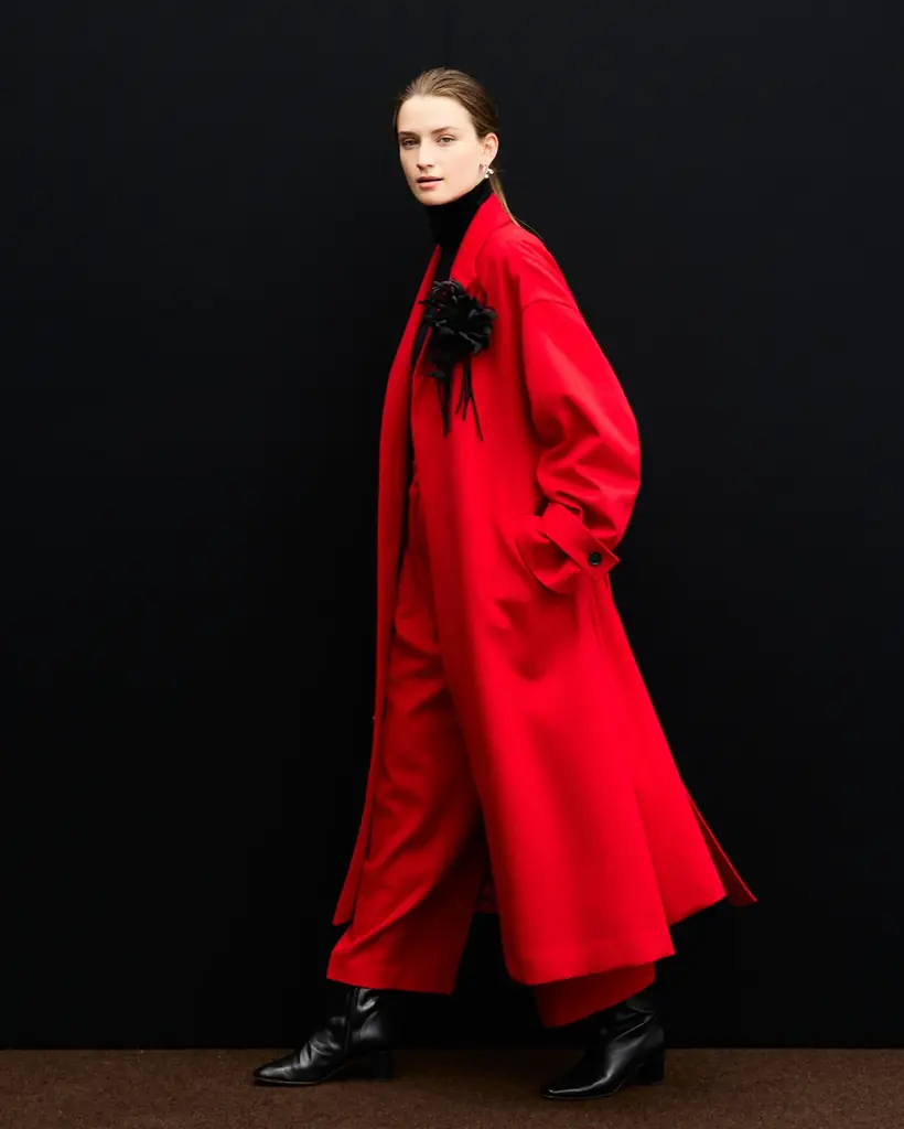 注目アイテムとして、真紅のウールをミニマルなシルエットで仕立てたセットアップや、粗い立体感のある織り目が特徴のツイードコートが挙げられます。いずれのアイテムもジャパンメイドの生地が持つ表情を重視しており、尾州の織物の伝統美を現代的に提示するラインナップです。