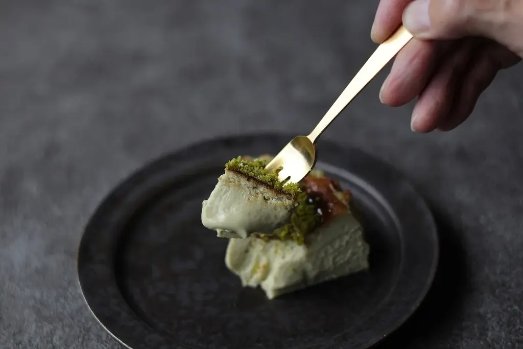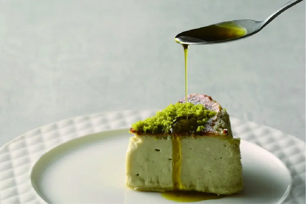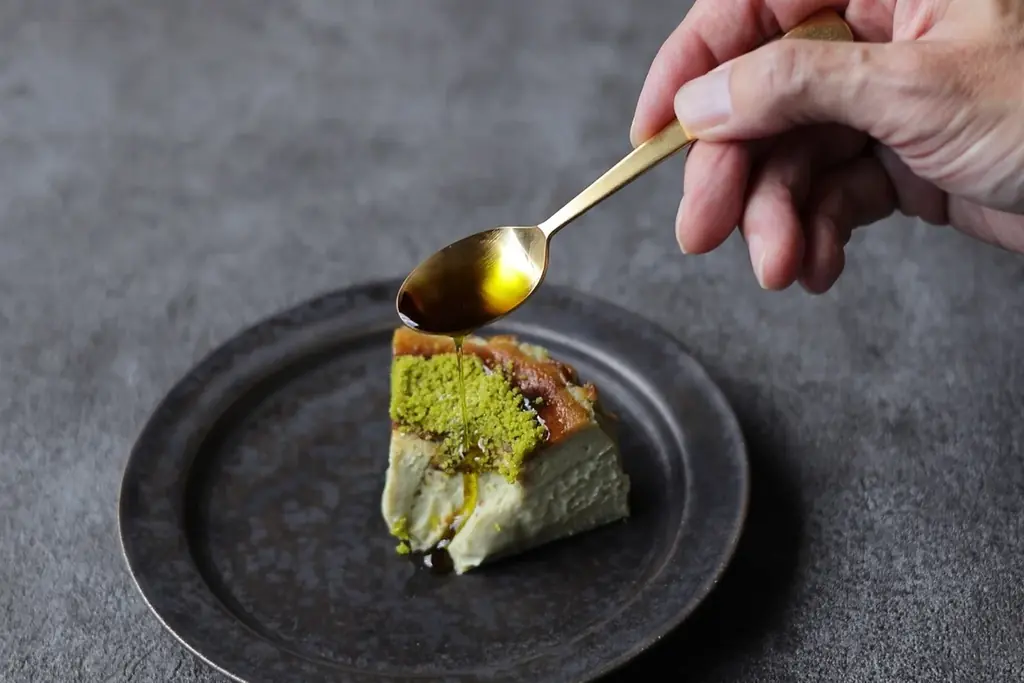 提供方法としてはまずそのまま一口。濃厚なチーズとピスタチオの風味を確認した後、仕上げに付属のピスタチオオイルをひとさじ垂らすと、香りとまろやかさがさらに深まります。オイルをかけることで香りが立ち、後味に豊かな余韻が残る設計です。