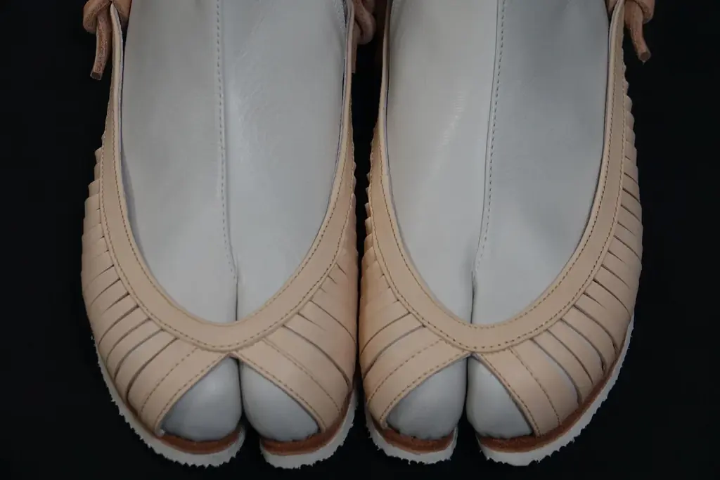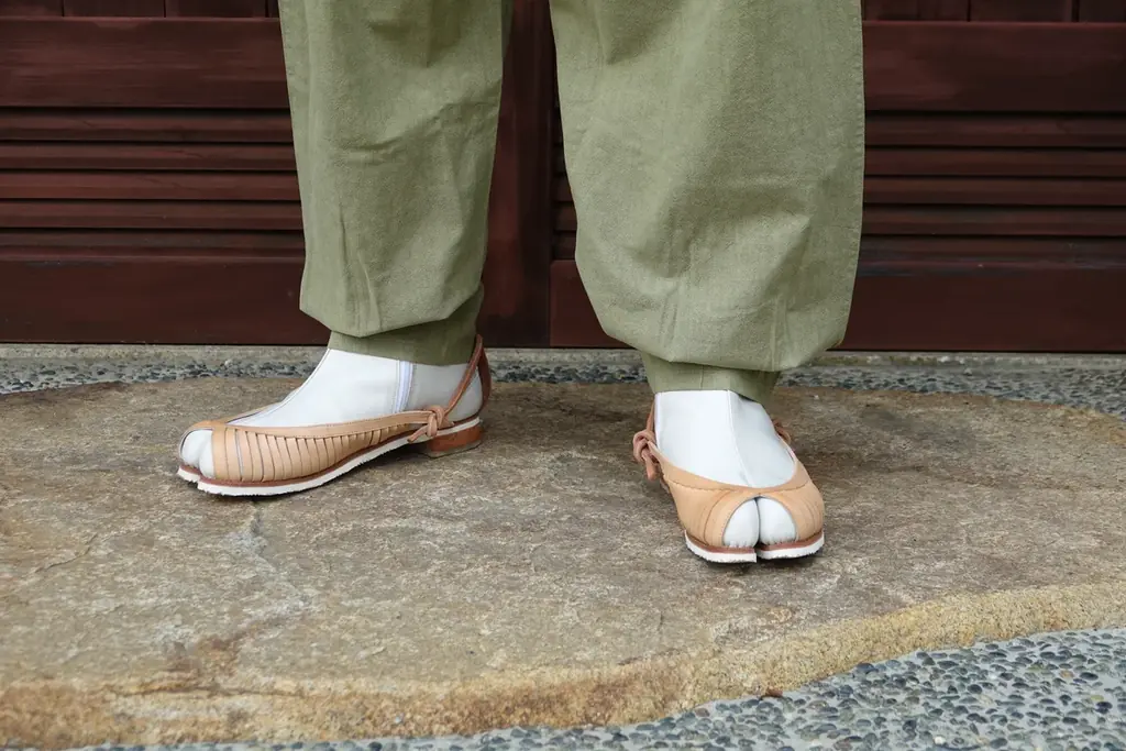 吉靴房の技術により、革底からシームレスに革紐を取り回す設計が採用されています。縦型のスリット部分は端にノットを作り、単なる装飾ではなく、足袋のシルエットを足の動きに合わせて支える構造的機能を果たしています。