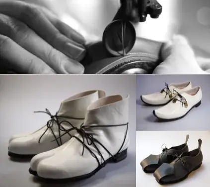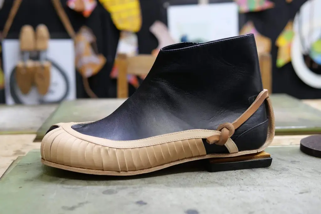 | デザインの特徴 | 中央の足袋由来プリーツ、チプシンを模したスリット、革底から取り回す革紐とノットによる構造的サポート |