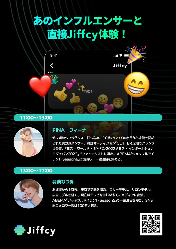 テキスト通話アプリJiffcyを使った体験コーナー。声を出さずに電話のような呼び出しとリアルタイムのテキスト通話ができる特性を活かし、「あの有名人と話せるかもしれない」体験を提供します。