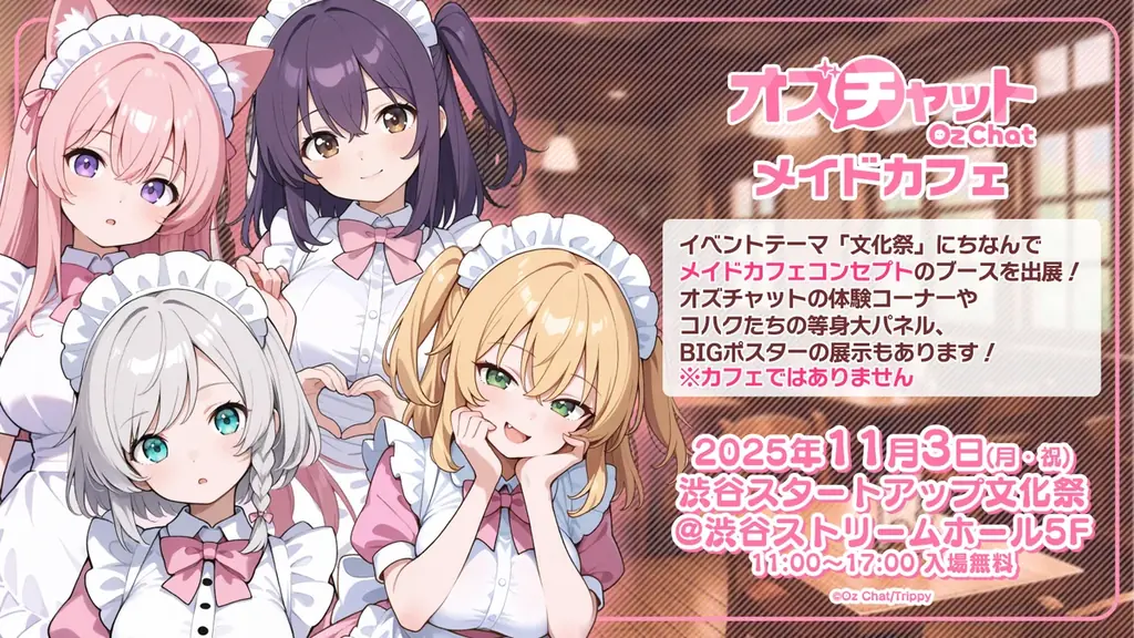AIキャラクターとリアルタイムで会話できる「オズチャット」のメイドカフェ体験を実施。人気キャラがメイド姿で来場者と会話し、限定グッズの販売も行います。