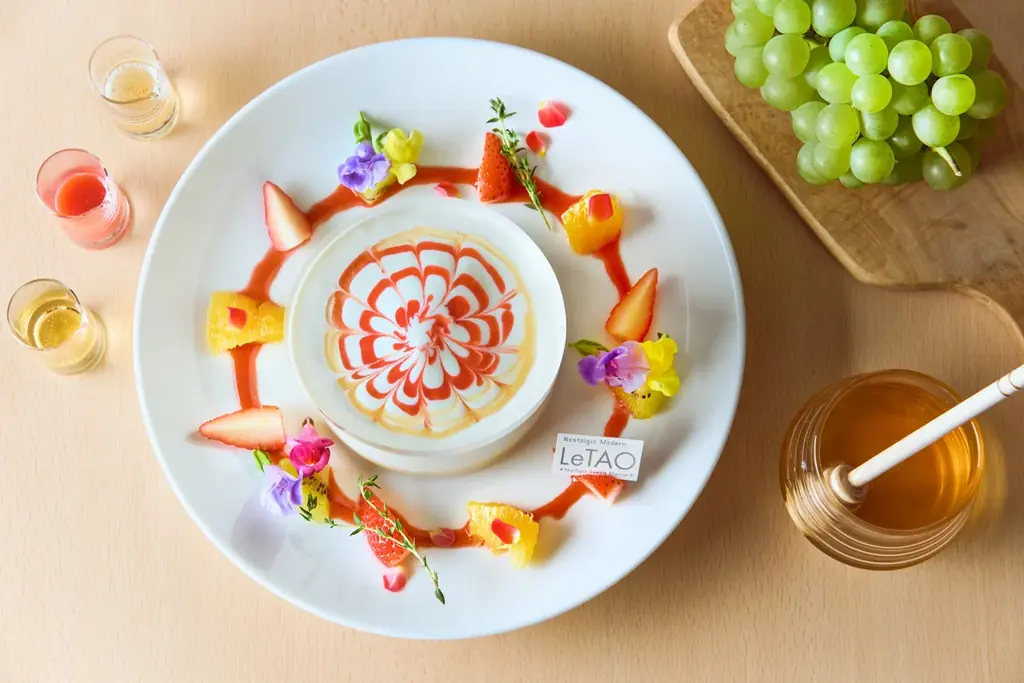 提供方法にも工夫があり、スフレにクリームとソースをかけて模様を描き、最後にフィルムを外すことでクリームがスフレを覆う「体験型スイーツ」として演出されます。視覚的な仕掛けを含めた提供により、滞在の特別感を高める構成です。