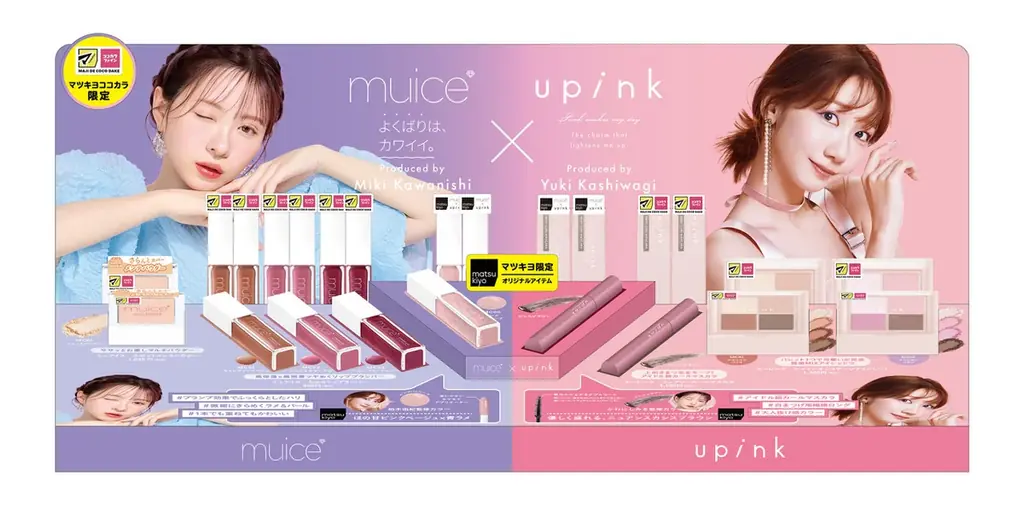 今回 matusukiyo から数量限定で販売されるコラボ商品は、互いのブランドの人気アイテムを相互にカラー監修した2商品です。かわにしみきさんのブランドmuiceと、柏木由紀さんのブランドupinkそれぞれの「らしさ」を反映させた色設計がポイントです。
