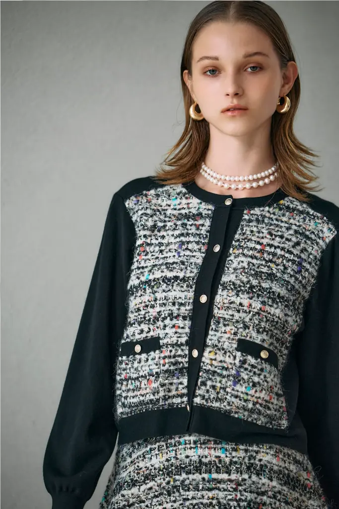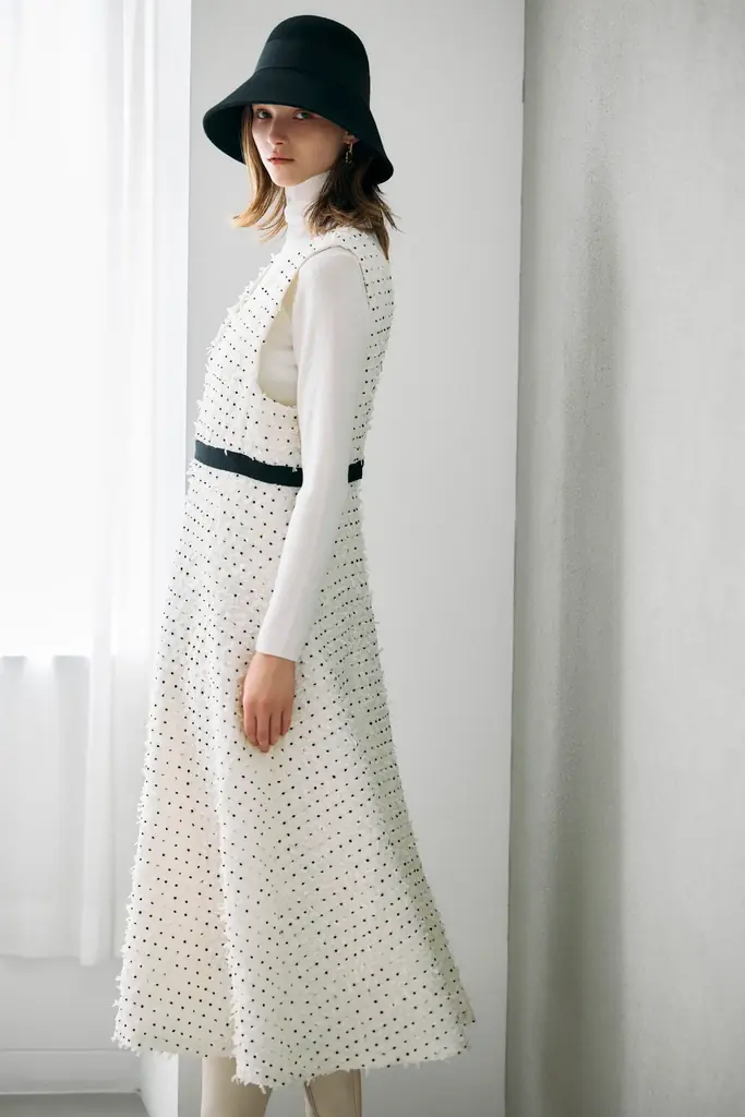 複数アイテムにわたってツイードやウールの質感が生かされ、品格あるデザインで統一されています。ワンピースやコートは冬の外出シーンで求められる保温性と美しさを両立させた設計です。