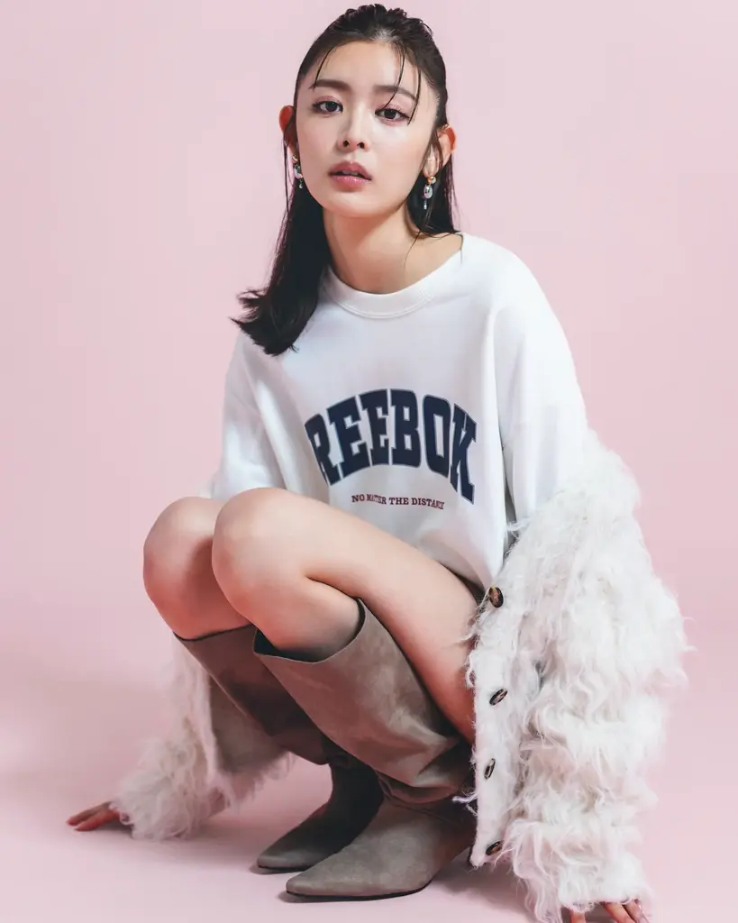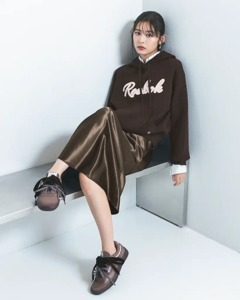 今回のコラボレーションは、ボアアウター、ポロニット、ラガーニット、ロゴスウェット、ニットフーディー、ミニスカートの6型のウェアに加え、雑貨としてReebokの名作スニーカー「CLUB C」の別注モデル、リュック、ミニバッグ、キャップをラインアップしています。FRAY I.DのエレガンスとReebokのスポーティな機能性を両立する設計が特長です。