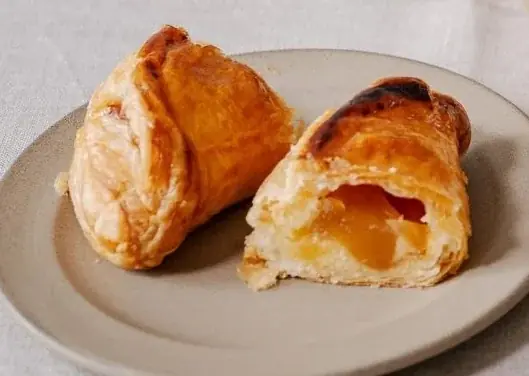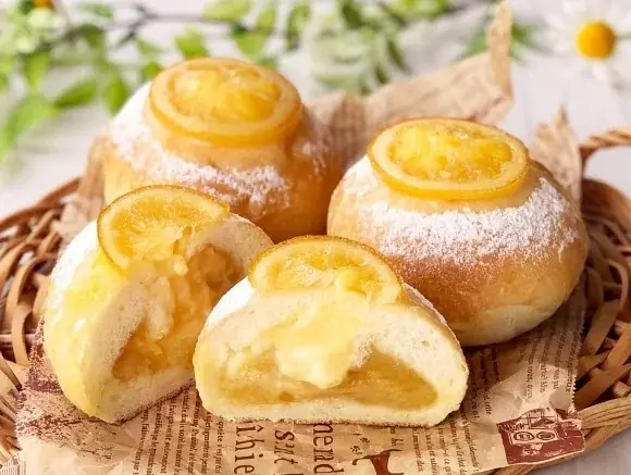 北海道産小麦のパン生地でスイートポテトと角切りりんごを包み、上からカスタードクリームを絞って焼き上げる。スイートポテトの甘みとりんごの酸味、トッピングのレモンの爽やかさが調和する。