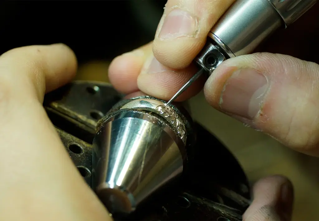 製造工程の概要は、デザイン確定→素材準備→加工(鍛造・成形)→石留め→仕上げ→品質検査→出荷という流れで、工場内で一貫して行われます。