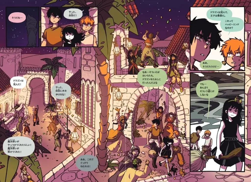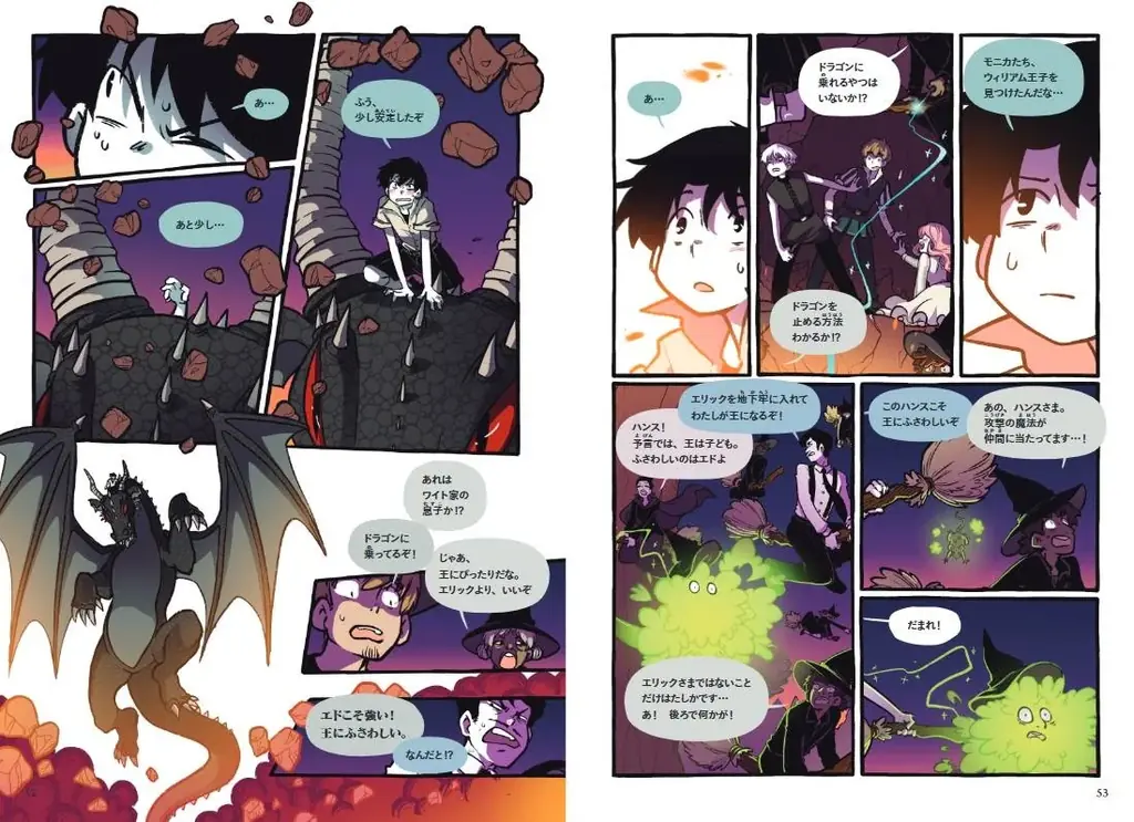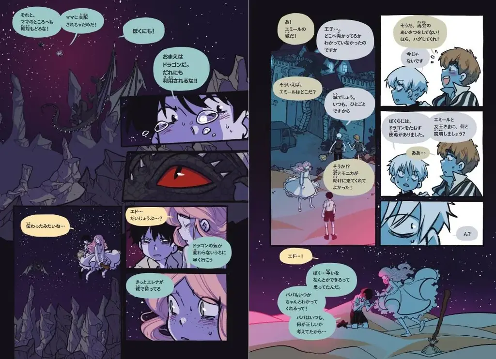 展開はスピード感がありつつも登場人物の心理描写が重視されており、特にエレナとエドの葛藤、子どもたちが互いの違いを越えていく過程、そして争いの根源に迫る描写が読みどころです。物語中、行方不明の王子の居場所がつきとめられる一方で、エレナたちは人魚にとらわれる出来事が起こり、ふたごの両親を先頭に魔法使いたちが迫る場面が緊張感を高めます。